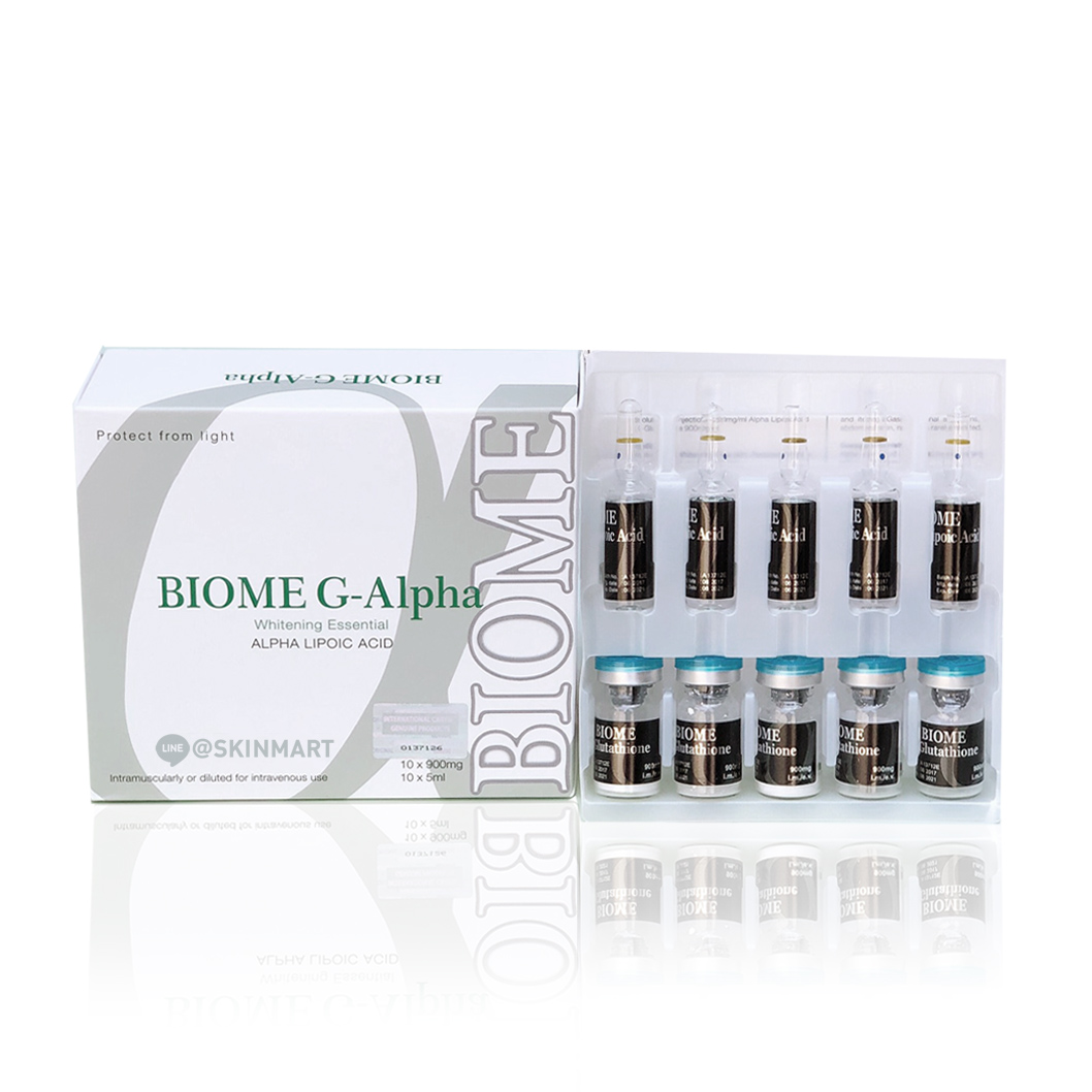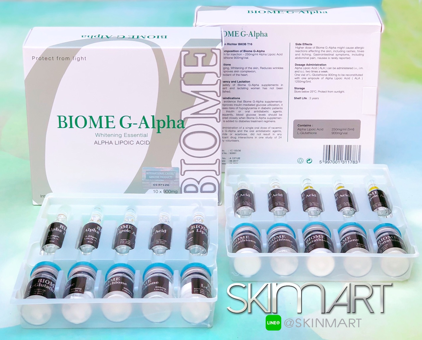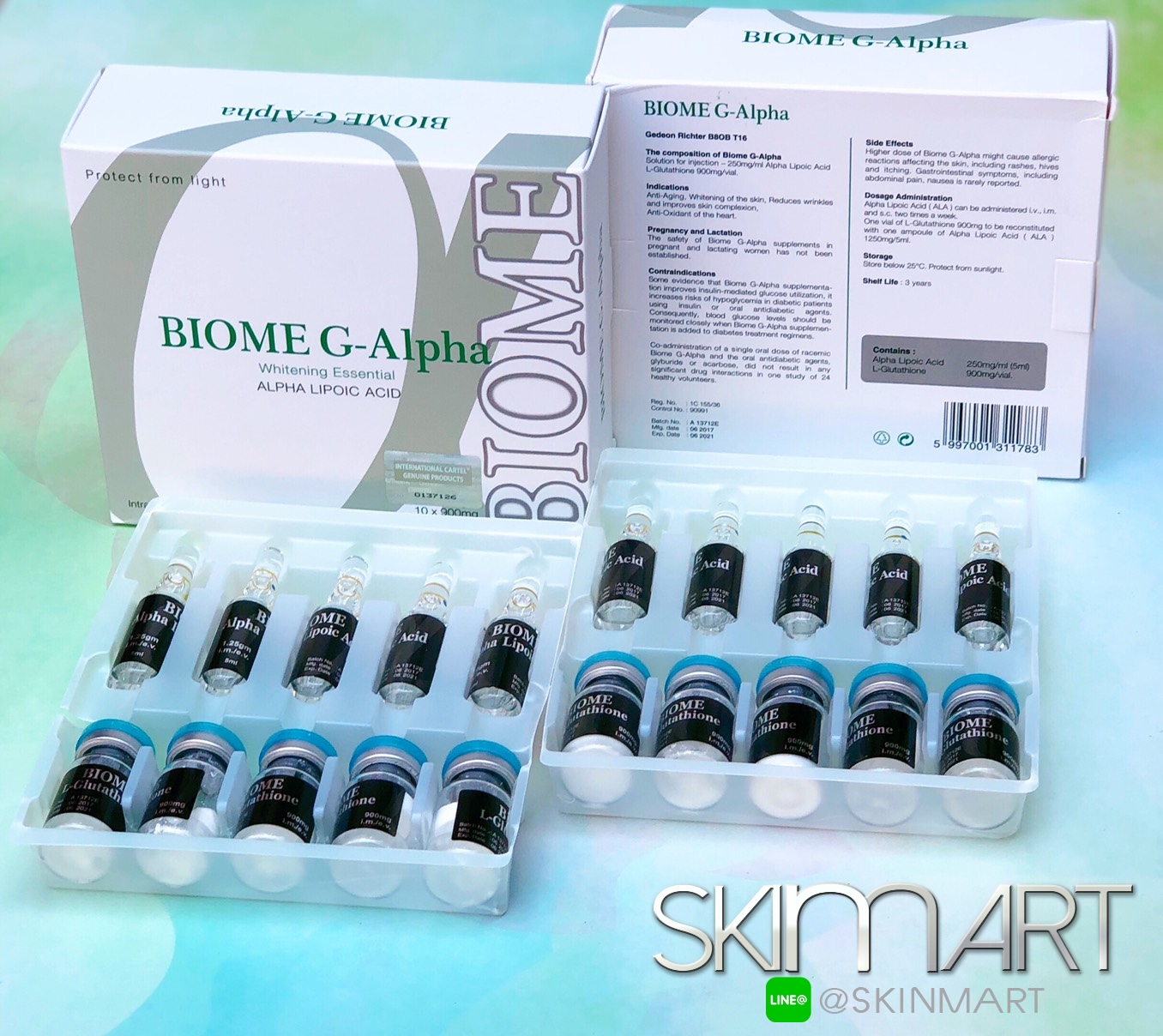 Biome G-Alpha Glutathione ตัวใหม่ล่าสุดจากประเทศอังกฤษ สำหรับผู้ที่ฉีดกลูต้าไธโอนแล้วได้ผลช้าแก้ไขได้โดยการฉีด Biome G-Alpha Whitening Essential ซึ่งเป็นตัว Alpha Lipoic Acid เป็นตัวช่วยให้กลูต้าในตัวเราที่มีอยู่แล้วทำงานได้ดียิ่งขึ้น