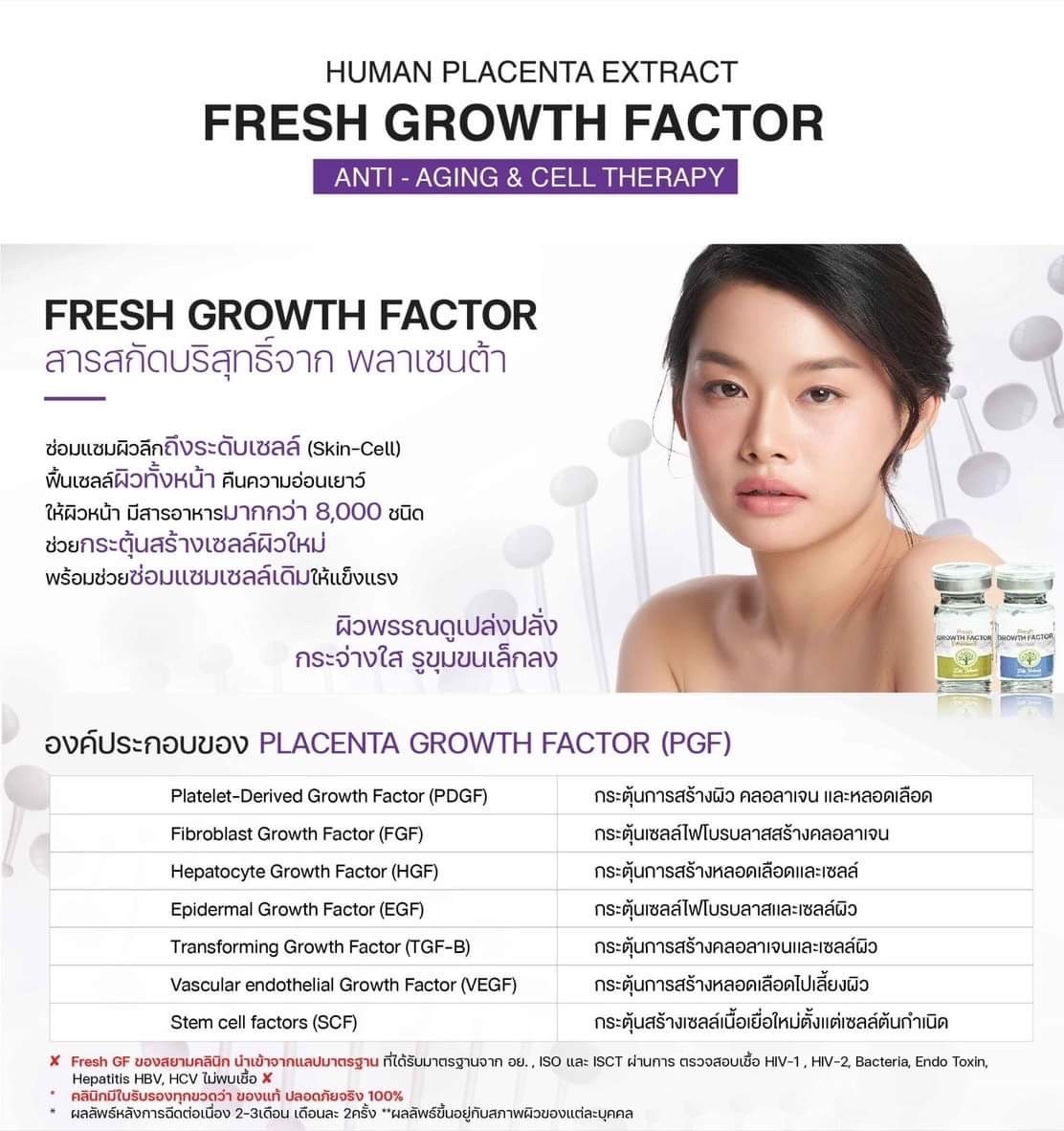 คือ สารสกัดธรรมชาติ ที่สกัดมาจากรก สามารถกระตุ้นให้เซลล์มีการเพิ่มจำนวน กระตุ้นการเจริญเติบโตของเซลล์ เร่งปฎิกิริยาการผลัดเซลล์ผิวใหม่ เร่งฟื้นฟูเซลล์ผิวที่แห้งกร้านจากแสงแดด ซ่อมแซมเนื้อเยื้อที่ถูกทำลายจากการเกิดบาดแผล ซึ่ง GF จะหลั่งออกมาเพื่อซ่อมแซมให้ผิวคืนสู่สภาวะปกติได้ในที่สุด
