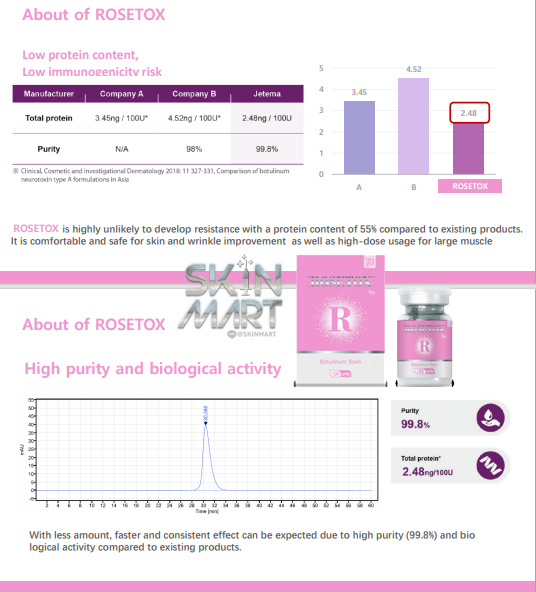 Botox RoseTox 100u-200u ยกกระชับกรอบหน้า ตัวยามีความPurifiedสูงมาก ฟิล์มบางๆ บรรจุแบบสูญญากาส ต้องผสม Nss ก่อนใช้งาน